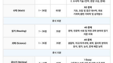ACT란 무엇인가요? ACT (American College Test)는 SAT와 함께 미국 대학 진학 희망자들을 대상으로 하는 대입 평가고사입니다. SAT 시험은 사고력과 문제 해결력을 측정하는데 비해 ACT는 실제 고교 교과 내용 지식을 측정합니다.ACT 공식 홈페이지: http://www.act.org ACT 시험 형태 ACT는 English, Math, Reading, Science, Essay (선택) 섹션으로 구성되어있습니다. 각 섹션 별로 1~36점으로 채점되고 있으며, Essay는 선택이며 별도로 채점됩니다.ACT 또는 SAT는 미국 대학교에 가기 위해 필요한 요소이며 둘 중 하나만 선택하여 시험을 보면 됩니다. ACT는 미국 전체 고등학교에서 사용되는 교과서와 학습 자료를 분석하여 만들어..