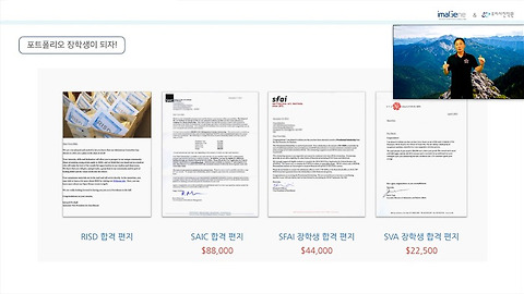 유학 성공 노하우 - 포트폴리오 장학생이 되자 (SVA,SAIC,SFAI 장학금 정보) 자녀의 유학을 생각하는 많은 부모님들은 다음의 질문을 하곤 합니다. "우리 아이가 미국 명문 대학 장학생이 될 수 있을까?""학교에서 장학금은 준다던데 유학생은 받기 힘들겠지?" 유학생이 미국의 대학에서 포트폴리오 장학생이 되는 것은 쉬운 일은 아니지만 불가능하지는 않습니다. 최근에는 진학한 우리 학원 학생들 대부분이 금액의 차이는 있지만 포트폴리오 장학금을 받고 진학을 하였습니다. 아래에 보이는 4장의 장학생 합격 편지는 미국 명문 예술대학에서 온 것입니다. 1. RISD(Rhode Island School of Design) 같은 경우는 합격 만으로도 미국 유학생과 학부모 커뮤니티에서 인정받는 명문 대학입니다. 2..